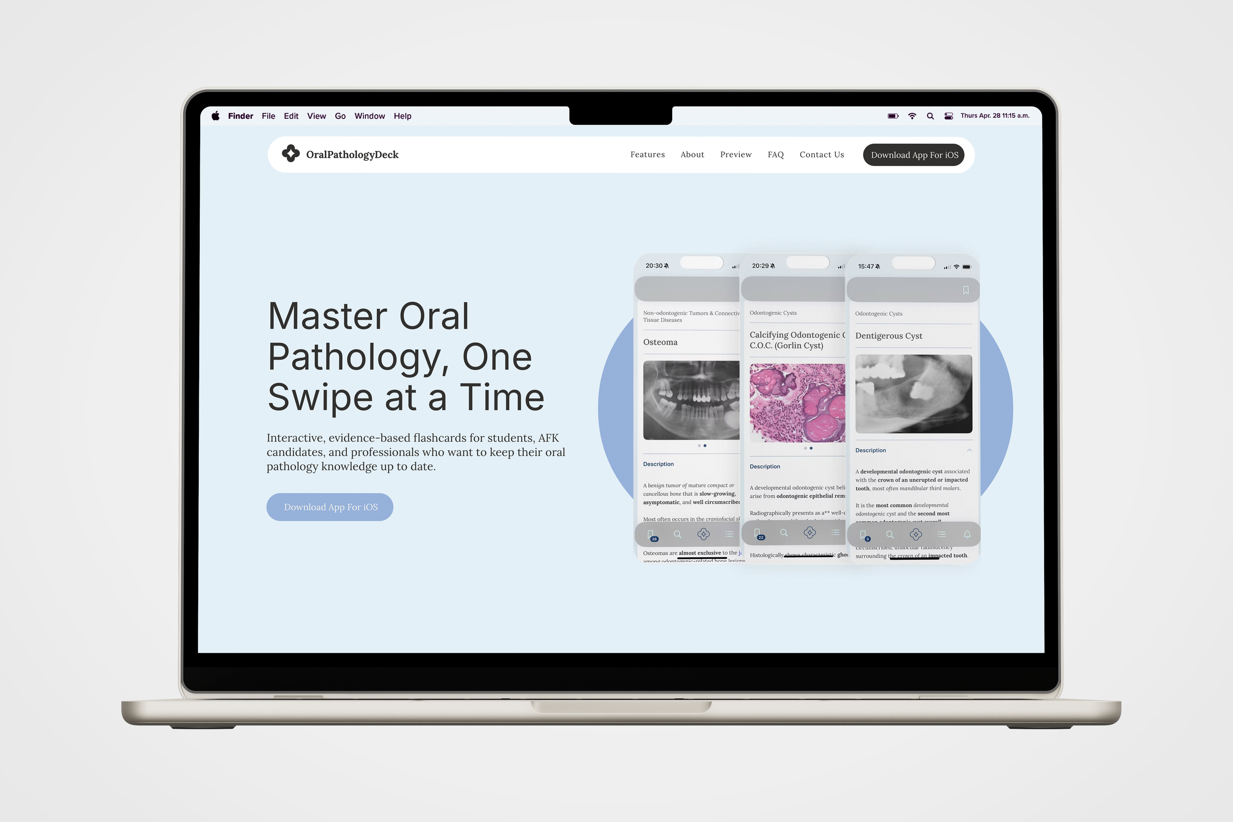 OralPathologyDeck is an iOS study app I designed and built to organize and present over 260 oral pathologies in a clear, structured flashcard format. My focus was on creating an efficient information architecture that supports different study workflows through features such as Swipe, Search, Content navigation, Bookmarks, and customizable study notifications. The goal was to reduce cognitive load and allow users to move fluidly through dense clinical material.